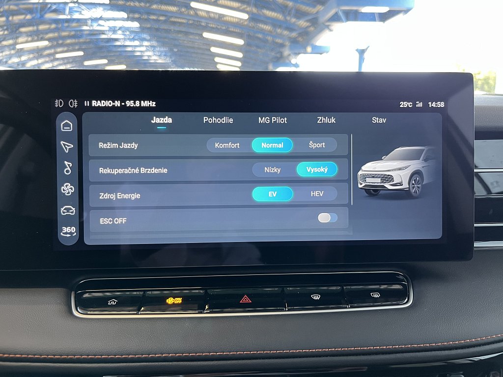 Alarm - elektronické zabezpečenie, Elektronický imobilizér, E-CALL system, ABS+EBD, ESP, MG Pilot, Autohold, EPB, Núdzové udržiavanie jazdného pruhu (ELK), Detská poistka zadných dverí, Zadné sedadlo ISOFIX s horným uchytením, a spodným kotviacim bodom, Systém monitorovania tlaku v pneumatikách (TPMS), 7 airbagov, 360° kamera, Dažďový senzor, Zadné parkovacie senzory, LED svetlomety s manuálnym nastavením výšky svietenia, Automatické svetlomety, Funkcia "Follow me home", Zadné hmlové svetlo, LED vysoko umiestnené brzdové svetlo, Predné hmlové svetlá, Prepojené LED zadné svetlá, 12,3" duálny zábavný systém, Satelitná navigácia, 8 reproduktorov, 4 USB porty, DAB+, Bluetooth, Voľba jazdného režimu, Vonkajšie spätné zrkadlá s LED bočnými smerovkami, Vyhrievané spätné zrkadlá, Tónované sklá, Zatmavené sklá od B-stĺpika, Strešné lišty, Predná 12V zásuvka, Osvetlenie batožinového priestoru, Predná stredová lakťová opierka s úložným priestorom, Elektrické ovládanie predných a zadných okien, Elektricky nastaviteľné sedadlo vodiča v 6 smeroch, Infotainment s 10,25" farebným displejom, Digitálna klimatizácia s filtrom PM 2.5, Výškovo a pozdĺžne nastaviteľný volant, Zadné sklopné sedadlá v pomere 60:40, Bezkľúčové odomykanie a zamykanie, Elektricky sklopné vonkajšie spätné zrkadlá, Vonkajšie spätné zrkadlá s pamäťou, Elektrické ovládanie dverí batožinového priestoru, Pamäť pre nastavenie vodičovho sedadla, Vodičova bedrová opierka nastaviteľná v 4 smeroch, Elektricky nastaviteľné sedadlo spolujazdca v 4 smeroch, Vyhrievanie predných sedadiel, Bezdrôtové nabíjanie telefónu, Online služby (služby zahŕňajú počasie, Live Trac,, Amazon Music), iSMART (geolokalizácia vozidla, diagnostika vozidla,, zamykanie/odomykanie vozidla, ovládanie klimatizácie, a vyhrievania sedadiel na diaľku pomocou smartfónu), iSMART Lite (geolokalizácia vozidla, diagnostika vozidla,, zamykanie/odomykanie vozidla)*, Čalúnenie z perforovanej kože, Automatická dvojzónová klimatizácia